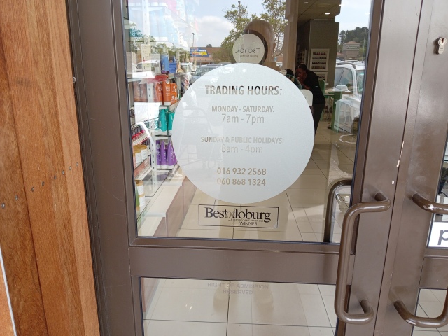 Sorbet Sorbet TRADING HOURSMonday – Saturday 7:00-19:00Sunday 7:00-17:00 Holidays – 7:00 to 17:00Address : Riverside Boulevard Shopping Centre, Corner Frikke Meyer, Chopin St, Vanderbijlpark, 1911Contact detailsPhone : 083-521-7061